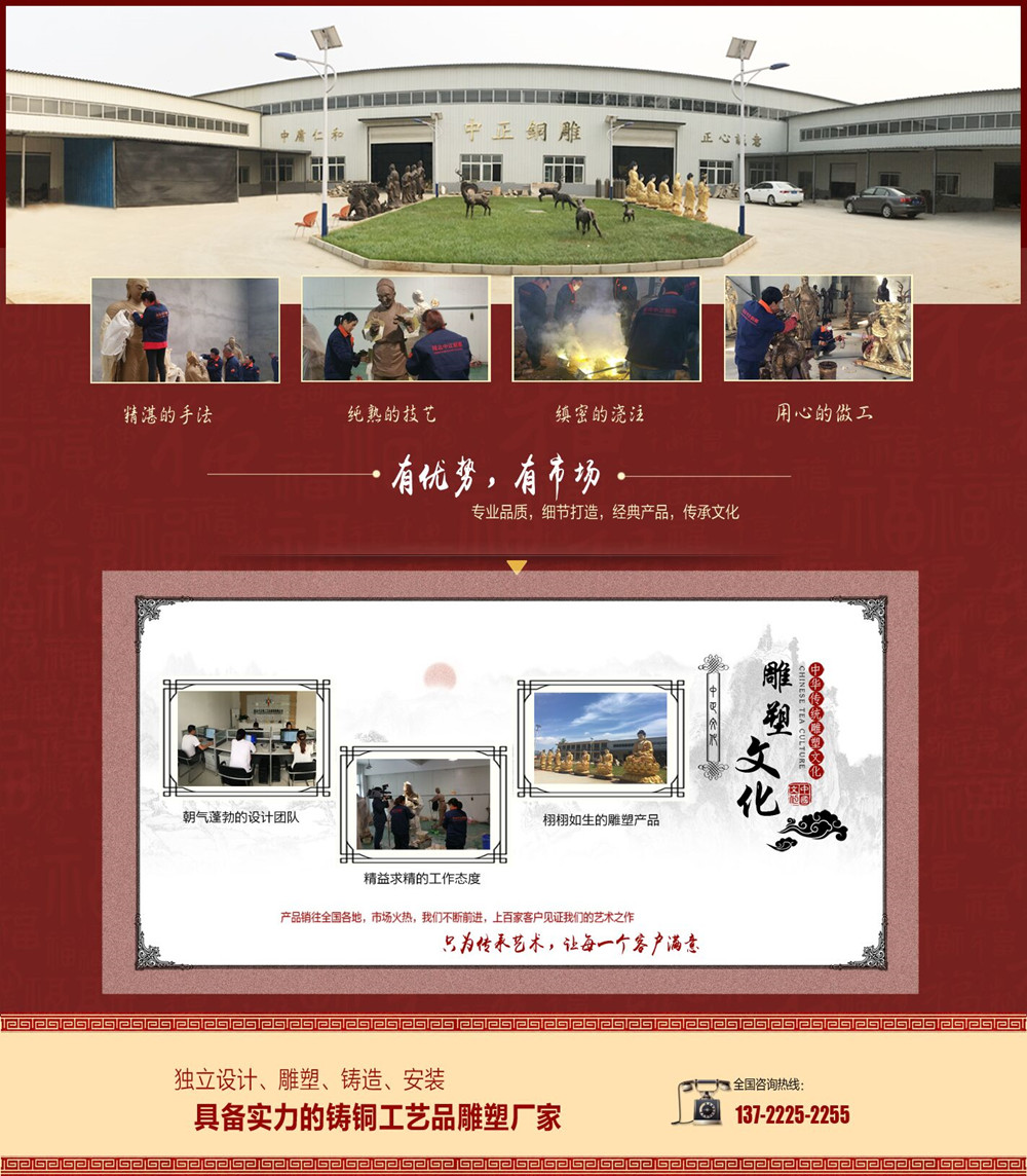 唐縣中正鑄銅雕塑制作生產(chǎn)廠家是一家具有獨(dú)立設(shè)計、雕塑、鑄造、制作施工能力的單位。擁有完善的,大型的,先進(jìn)的生產(chǎn)設(shè)備,并由多位經(jīng)驗豐富的高級鑄造技師指導(dǎo)生產(chǎn)及制作。公司主要鑄造人物雕塑、動物銅雕、城市雕塑、銅佛像、銅獅子、鑄銅鼎、銅鐘等銅工藝品,可按客戶提供銅雕圖片訂做加工,銅雕塑做工精美,質(zhì)量有保證。